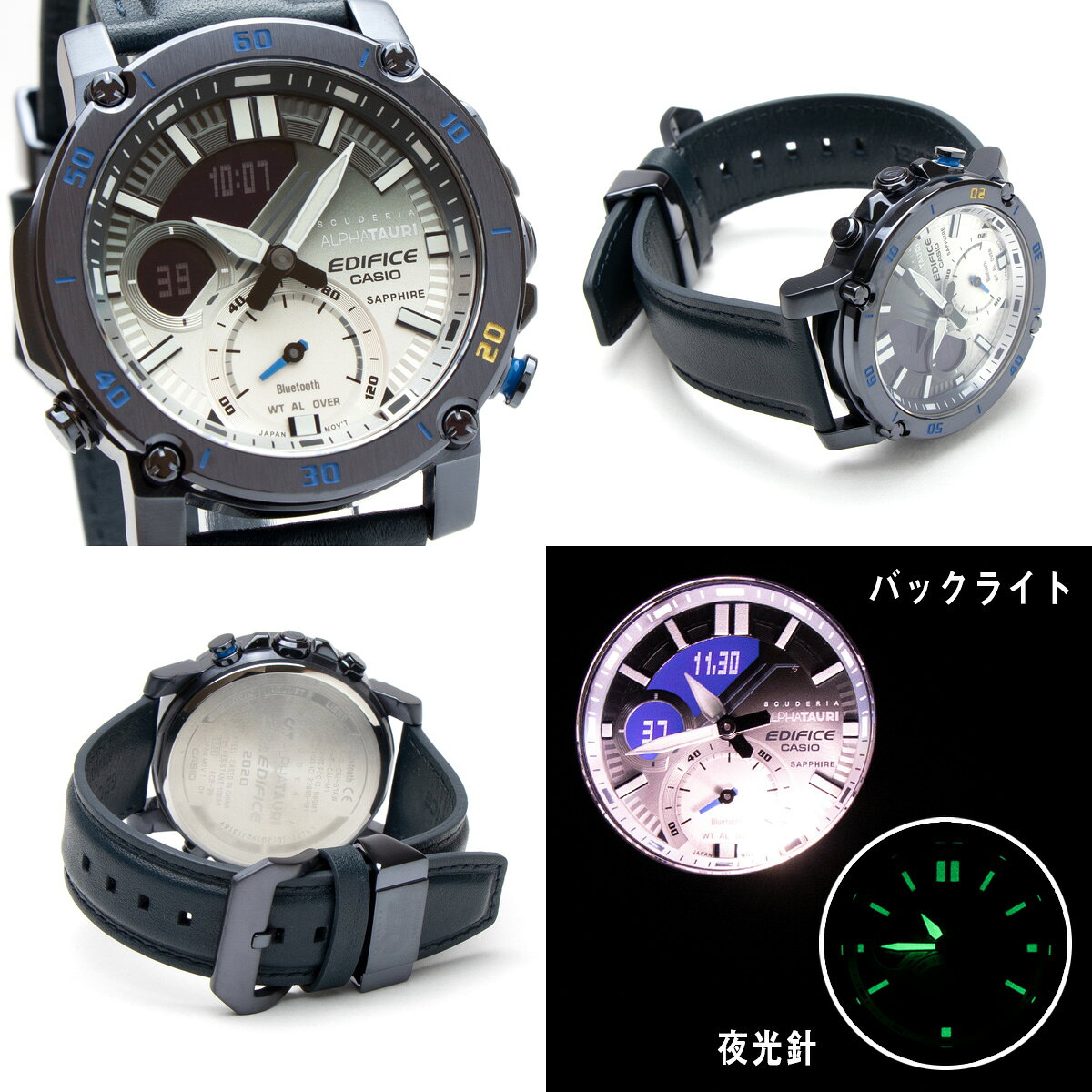 ビジネスシーンにもカチッと決まる洗練されたデザイン 暗闇でも視認性バツグン ダブルLEDライト ケース ステンレススチール(IP処理)(H49.5×W46×D12.5mm) ベルト レザー(内周16.0cm〜21.5cm対応)ラグ21mm幅 仕様・機能 ・内面無反射コーティングサファイアガラス ・10気圧防水 ・ネオブライト(蓄光針,インデックス) ・モバイルリンク機能(対応携帯電話とのBluetooth®通信による機能連動) (※スマホの着信を通知する機能はございません。