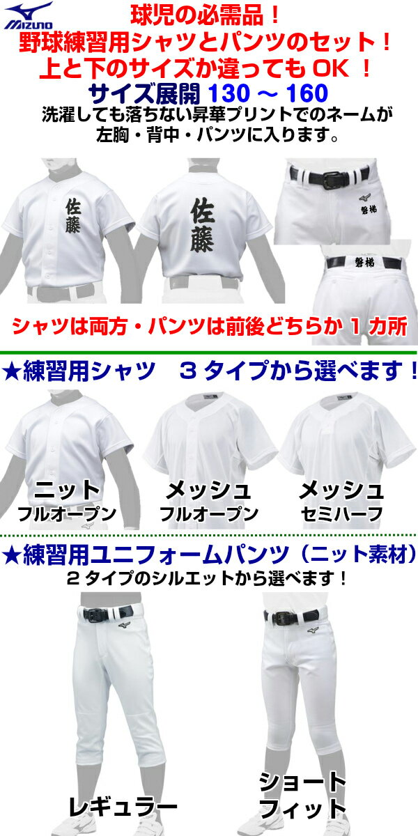 【ミズノジュニア用ネーム入り野球練習着上下セット】 それぞれのタイプからお好みで選べる練習着。